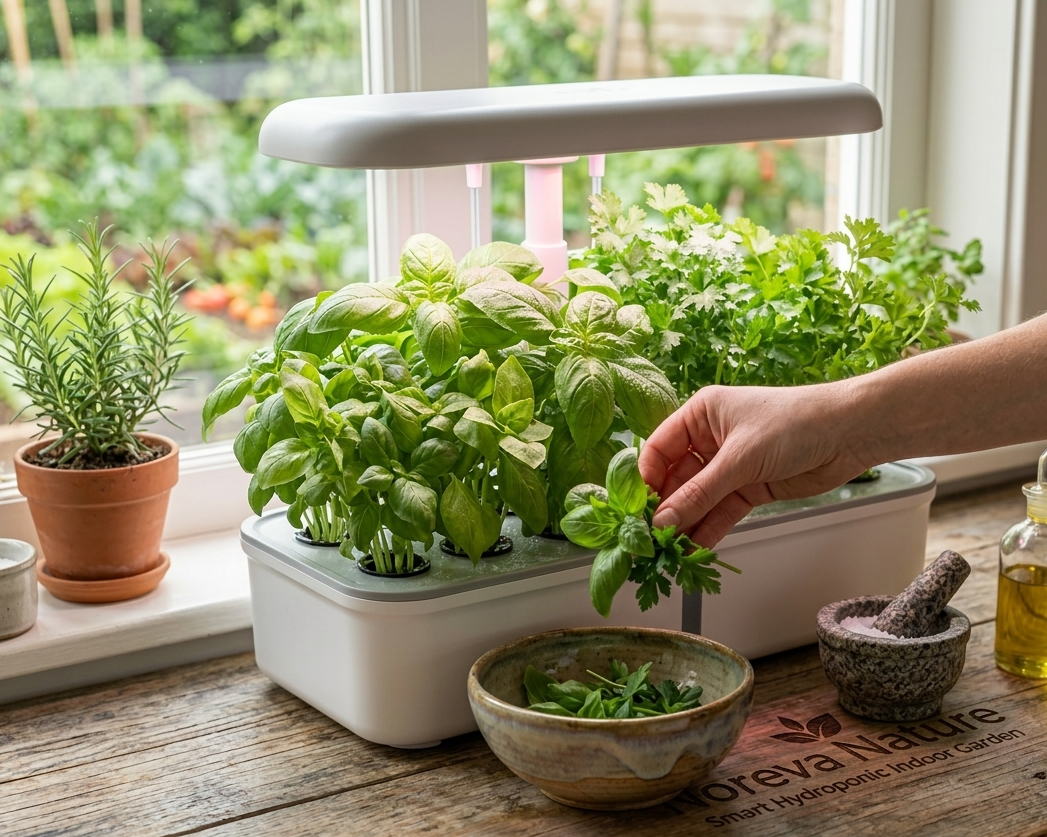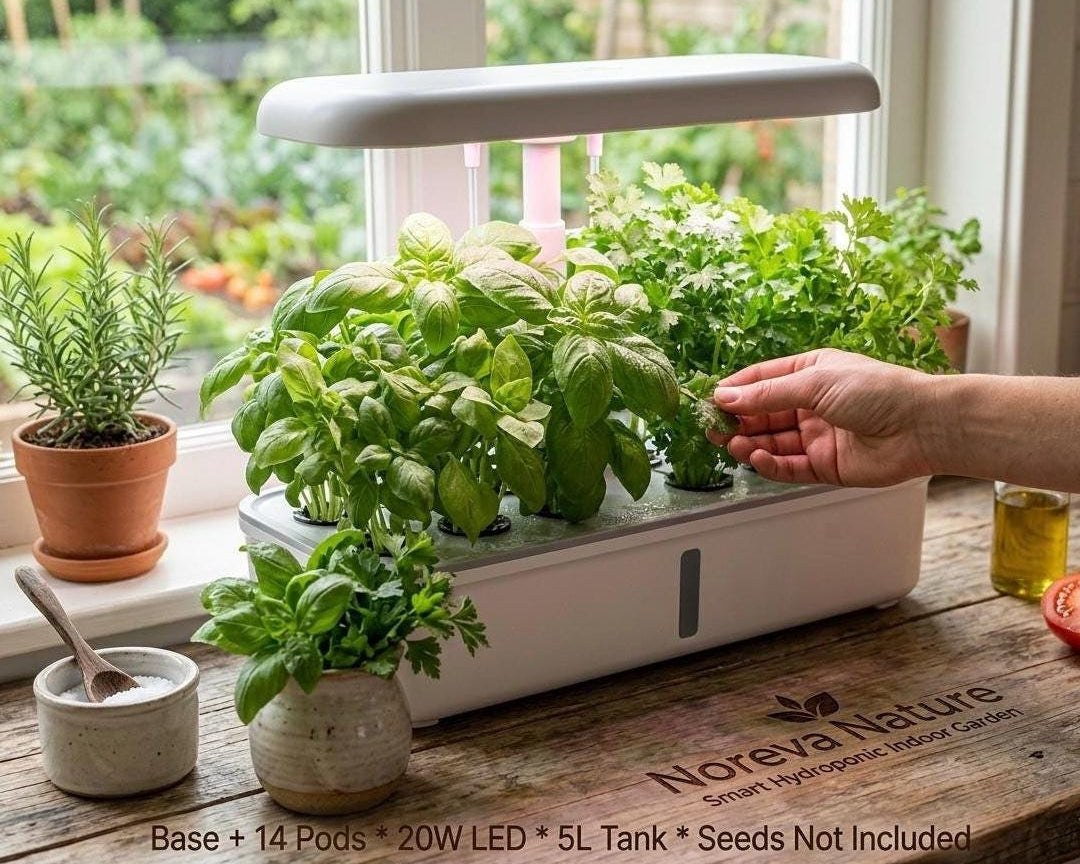 Imaginez cueillir du basilic frais, des tomates cerises juteuses ou de la menthe parfumée directement sur votre plan de travail, 365 jours par an. Avec le jardin hydroponique intelligent Noreva Nature, la nature s'invite chez vous, sans terre, sans salissure et avec une simplicité déconcertante.